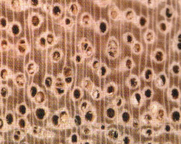 散孔材。管孔肉眼下明顯少而略大;主為單管孔,少數(shù)徑列復(fù)管孔(2~3個);含淺色臘質(zhì)沉積物和褐色樹膠。軸向薄壁組織肉眼下可見,發(fā)達(dá),環(huán)管狀、翼狀,聚翼狀及輪界狀。木射線放大鏡下明顯,密度中。窄。