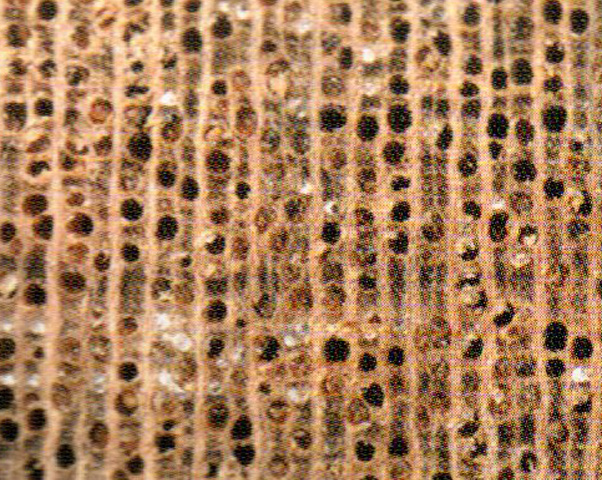 散孔材。管孔肉眼下可見,略少,略小; 單管孔;具白色沉積物和侵填體。軸向薄壁組織放大鏡下難見,有時可見離管短線狀。木射線肉眼下可見,數(shù)量中,略寬。軸向樹膠道肉眼下甚明顯,白色點狀或略弦向帶狀。